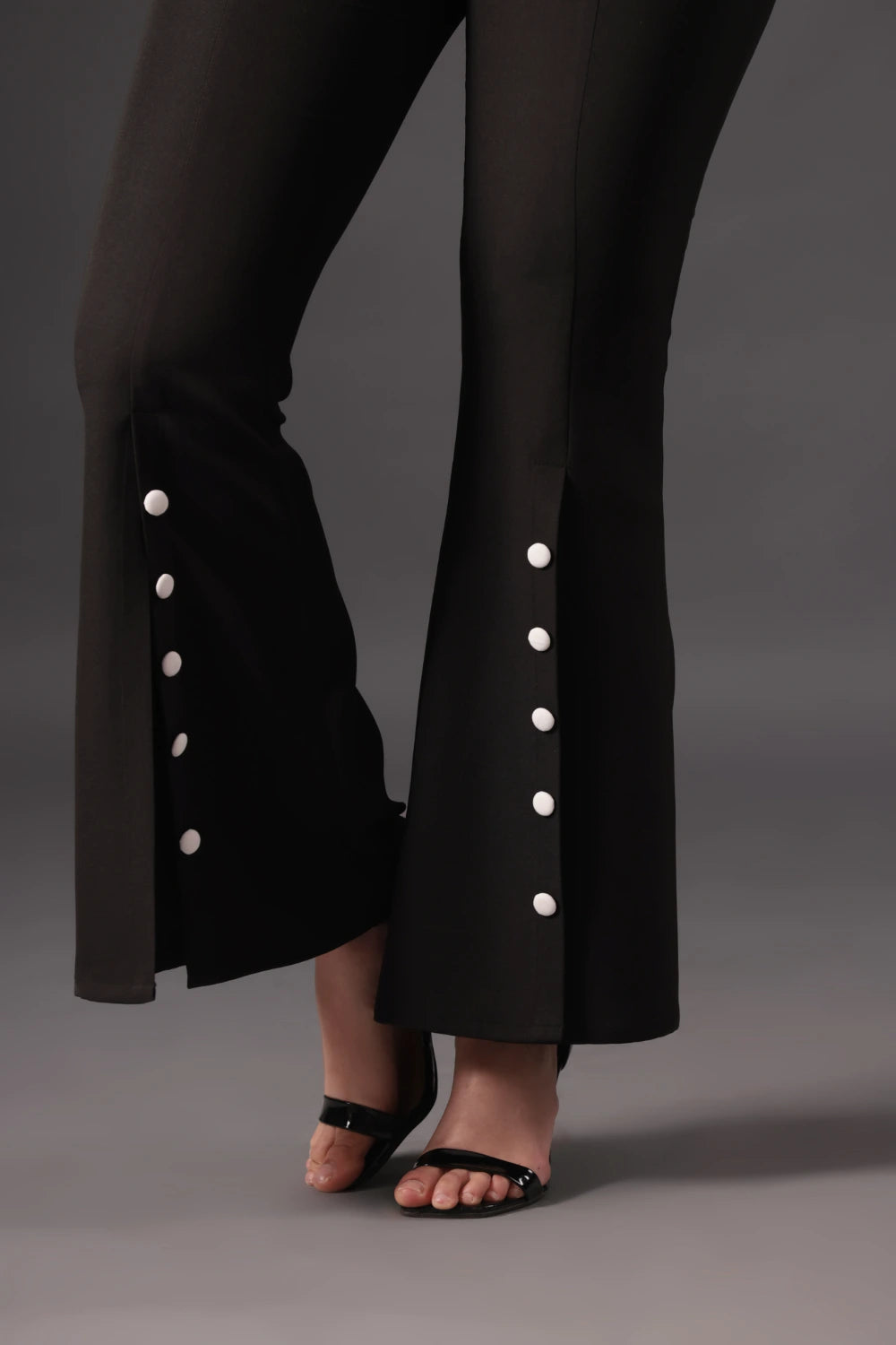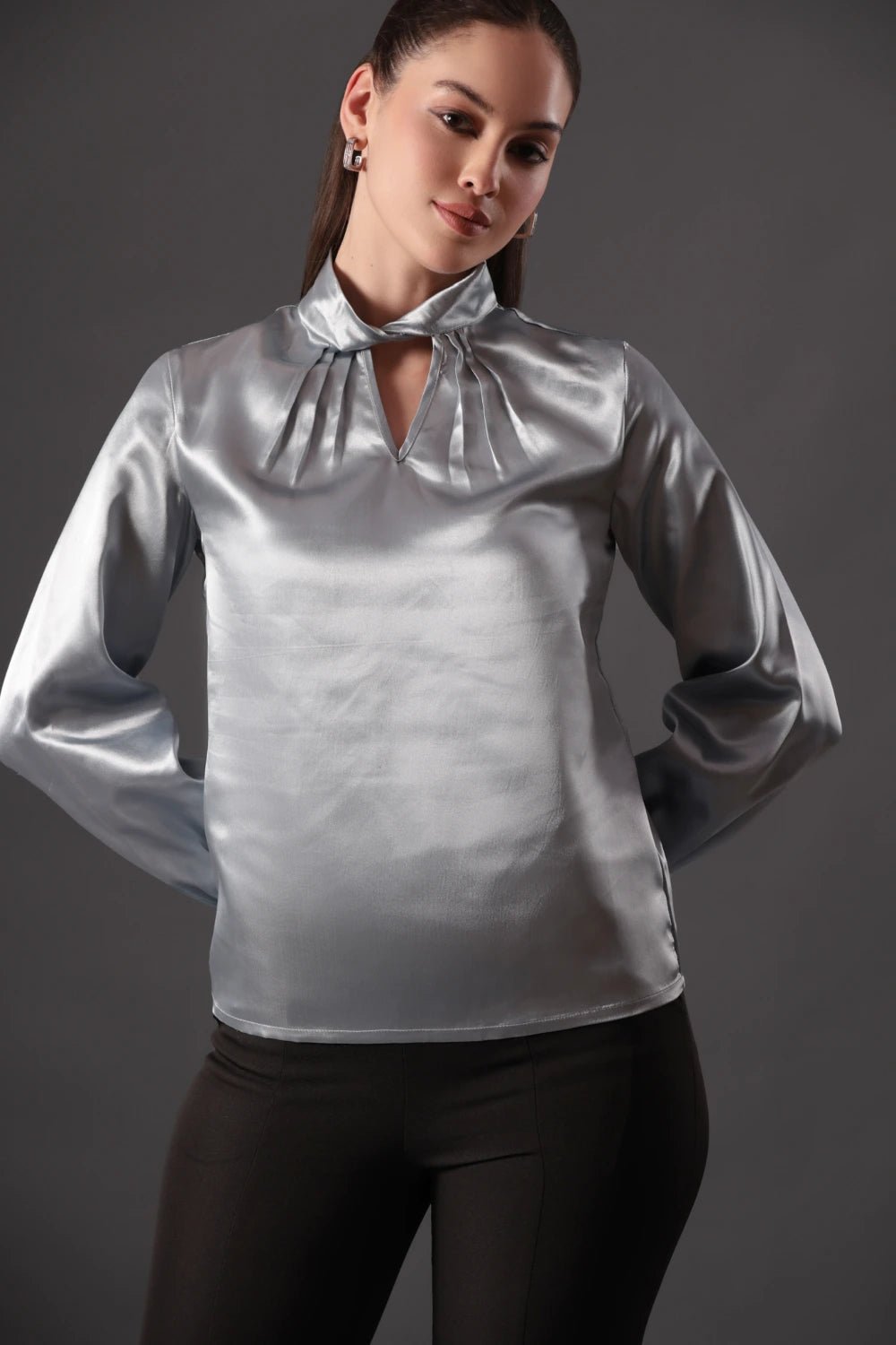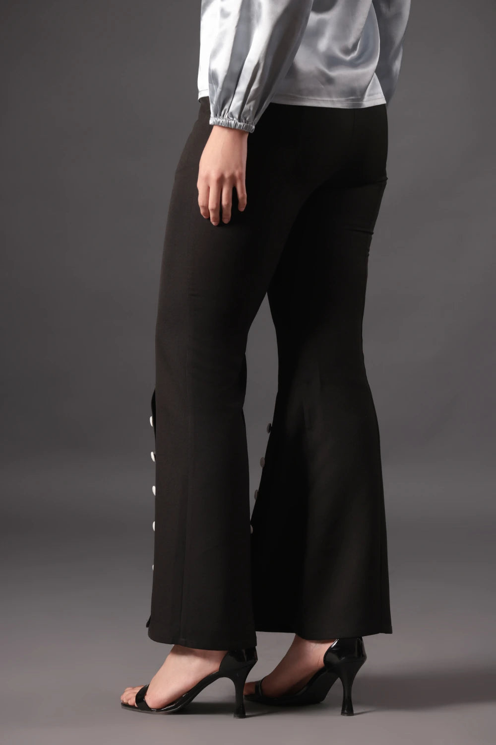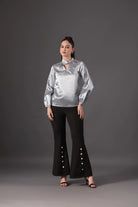 Liquid silver meets modern edge in this captivating outfit. The high-shine satin blouse drapes elegantly over the body, with soft pleats radiating from the keyhole neckline to frame the collarbone and add subtle drama. Long, gently puffed sleeves taper at the wrists, balancing structure with fluid movement. Paired with sleek black flared pants, detailed with a row of contrasting white buttons along the side slits, the look feels sophisticated yet playful, finished perfectly with minimalist black heels.