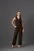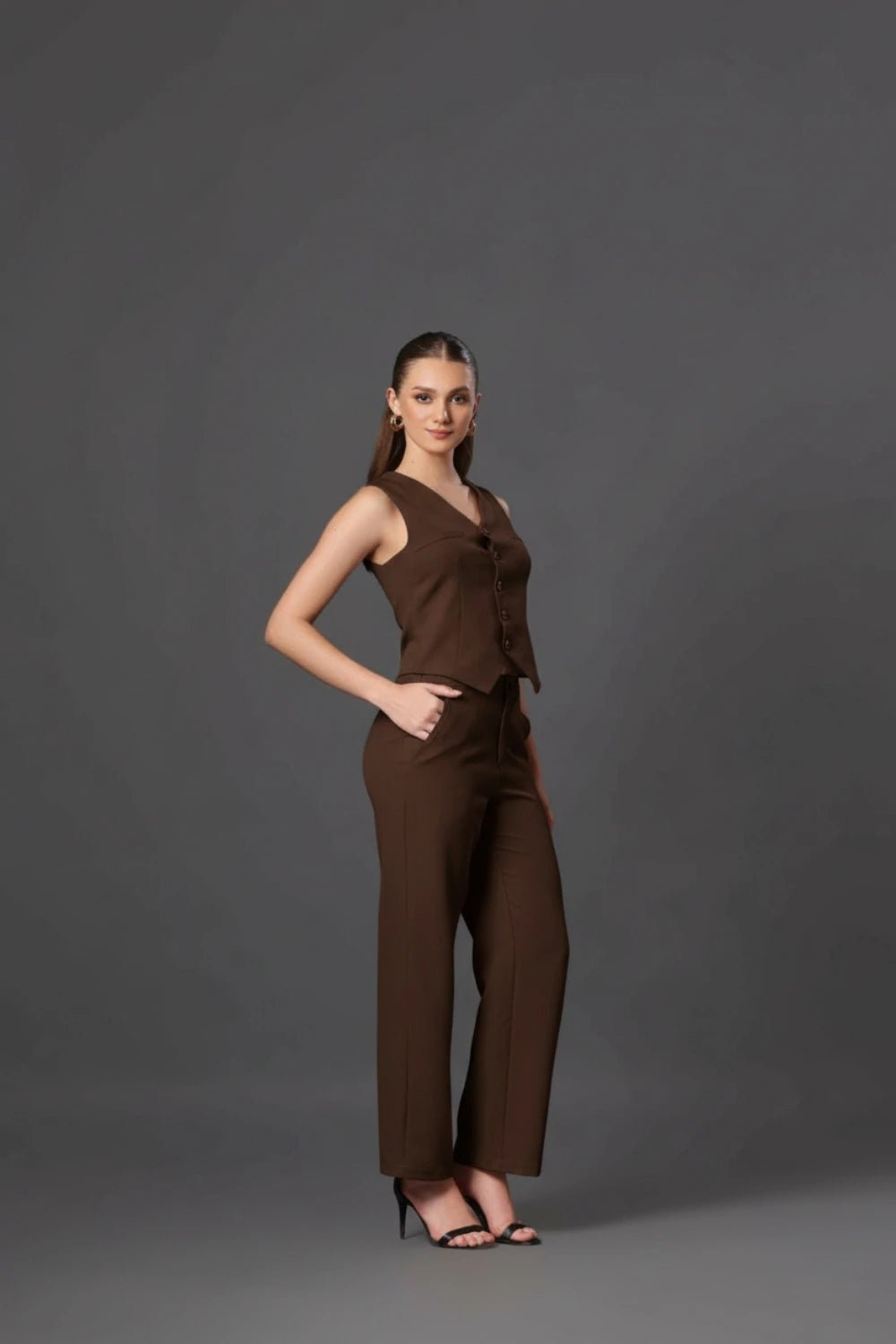 Thisis a love letter stitched in fabric, where every seam feels like a quiet promise. The rich chocolate-brown co‑ord, with its sculpted sleeveless vest and fluid straight‑cut trousers, wraps the body the way affection wraps the heart—firm, flattering, never overwhelming. Clean lines trace the silhouette like the outline of a perfectly written love note, while the gentle V‑neck and button‑down front invite the soft intimacy of eye contact across a crowded room.