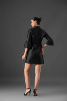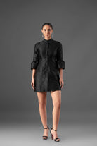 Step into the spotlight with the "Midnight Allure Mandarin Dress," a stunning piece crafted in luxurious black fabric that exudes understated glamour. The tailored silhouette features a sophisticated Mandarin collar and a sleek front button placket, leading to fine panel detailing that enhances the waistline for a flattering fit. The dress stands out with its unique three-quarter bell sleeves, adding a dramatic flourish, while the structured patch pockets and front slit detail blend style with functionality. Paired with minimalist ankle-strap heels, this modern shift dress embodies an effortless yet bold fashion statement, perfect for any occasion that demands chic refinement.