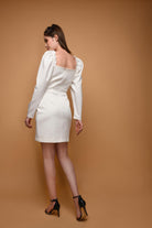 This stunning white bow-front mini dress is the epitome of contemporary elegance, seamlessly blending minimalist design with bold fashion-forward details. The dress features a structured, form-fitting silhouette that flatters and complements any body type, crafted from premium, high-quality fabric that drapes luxuriously against the skin. The signature element is the oversized fabric bow detail positioned at the bustline, adding a whimsical yet sophisticated touch that instantly elevates the dress from simple to statement-making. The dress boasts long puffed sleeves with delicate ruched details at the shoulders, providing a modern twist on romantic styling while maintaining an air of refined elegance. The sweetheart neckline creates a flattering V-shape that draws the eye upward, while the clean, structured bodice hugs the waist before transitioning into a sleek knee-length hemline that strikes the perfect balance between modest and daring.
